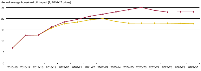 3.7 Thames Water customers are already paying for the project, and will continue to do so over its expected 120-year economic life. Thames Water's modelling indicates that the charge on the average annual household bill will rise from £13 in 2016-17 (in 2016-17 prices) to a peak of between £20 and £25 (in 2016-17 prices), before declining gradually (Figure 12 overleaf). This projection assumes that cost overruns are no higher than 30% of the £3.2 billion target price for the project works, although the Department considers the probability of this occurring to be below 5%.13 Bazalgette will invoice Thames Water on a monthly basis according to a charging formula similar to that used to calculate water bills in England and Wales. Thames Water is obliged under the terms of its regulatory licence to collect the required revenues from its customers and pass these to Bazalgette. Ofwat reviews and approves Tideway charges annually.