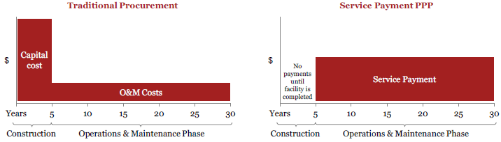 Although service-payment PPPs do not expand the funding available to government, they do allow government to spread its payment obligations over a long period of time. The diagrams below compare the payment obligations of government on a typical traditional procurement with those on a service-payment PPP.