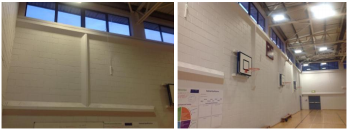 5.14.54 Representative photographs (Images 19 and 20) of the results of the application of the boxed in retrofitted windposts in the gymnasium at Drummond High School are shown below.