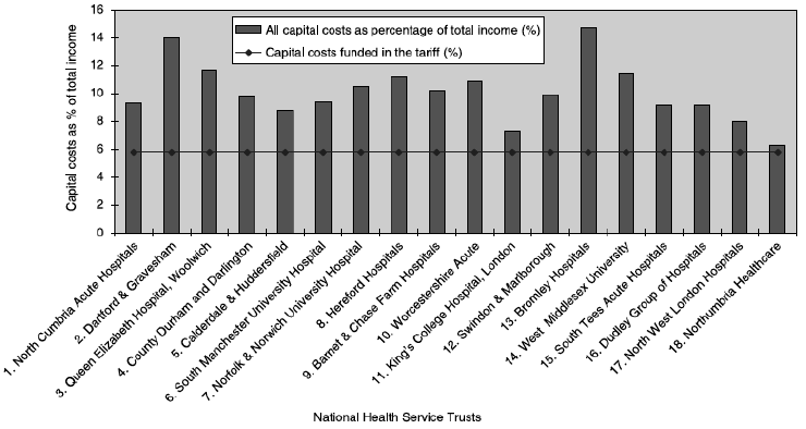 In 2002 a pricing system known as the national tariff hospital payment system was introduced. (The tariff is the UK equivalent of the diagnosis related group (DRG) hospital payment system). Under current activity -based reimbursement provisions for hospitals, 5.8% of the allocated resources are reserved for capital costs. However, the capital cost element in the tariff was in many cases less than the PFI fees actually paid. We found that of the 40 NHS trusts paying PFI unitary charges in 2005/06, had capital costs in excess of funding under the tariff. On average, trusts with PFI schemes that were operational and incurring charges in 2005/06 had capital costs of 8.3% that year - i.e. these trusts experienced an average shortfall in income of 2.5%.