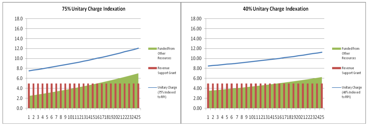 | Box 3 - Funding Structure - Local Authority Schools Project The graph below sets out the funding structure for a local authority schools project. In both examples below a fixed level (in nominal terms) of revenue support grant is committed from the Scottish Government (£5m), leaving the local authority to fund the remaining unitary charge due from their other resources. The authority can elect to grant either a higher level of unitary charge indexation (left graph - 75% indexation) and therefore reduce their early years unitary charge (UC) and funding requirement (in this example £7.5m UC and £2.5m in the first year), but require a higher UC and funding requirement at the end of the project (£12m and £7m respectively in example) or a lower level of indexation (right graph - 40%) and increase their early years UC and funding requirement (£8.5m and £3.5m respectively) but require a lower UC funding requirement at the end of the project (£11.2m and £6.2m respectively in example). Both scenarios assume a 2.5% inflation rate throughout the project term. The example in the left hand graph exposes the authority to greater inflationary risk. If the average inflation rate during the project end up being 4% not 2.5%, their funding requirement by year 25 increases from £7m to £11.3m. Whereas the same increase in inflation on the right hand graph would increase the funding requirement from £6.2m to £8.8m.