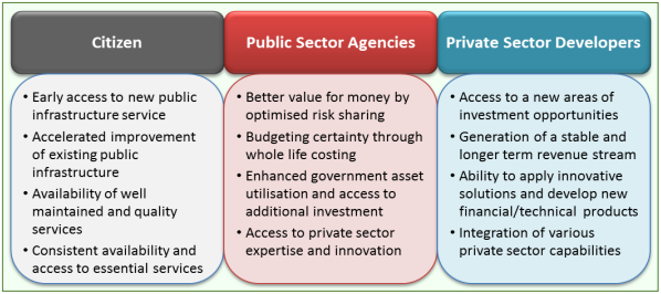The following diagram provides a snapshot of how PPP can typically benefit the key stakeholders who are involved in PPP arrangements: