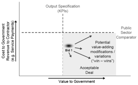 If outputs do not meet specifications, contract is not awarded (if project is in the bidding process) or contractors may be penalized. The area where KPIs are met and public sector underperforms in relation to the private contractor (in terms of cost and delivery) is where contractor is subject to payment.