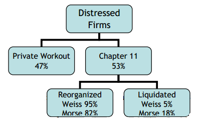 Two studies on the evolution of companies under Chapter 11 (Weiss 1990 and Morse and Shaw 1988) show that from these companies, 95% and 82% are reorganized, whereas the remaining 5% ad 18%, respectively, are liquidated. In average, 94% of the companies achieve reorganization (including the private workout and Chapter 11 Reorganization), whereas only 6% is liquidated.
