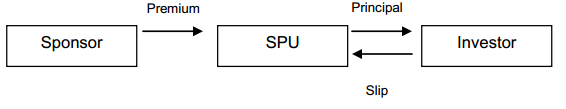 | CAT bonds transfer certain risks from the sponsor to the investors. In a typical issuance of CAT bonds, the sponsor (generally a reinsurer) creates a specific purpose unit (SPU) to make an issuance and invest capital in low risk values. The performance of these investments is paid to the bond holders together with the premium paid by the sponsor (diagram A). If, upon expiration of the bonds, the specified event did not occur, the investors recover the principal, as it happens in the case of ordinary bonds (diagram B). But if the specified catastrophe occurs during the life of the bond, the investors waive all or part of their right and the SPU pays the sponsor. In other words, the risk passes on to the investors. A. Transaction