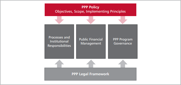 • Legal framework-the laws and regulations that underpin the PPP program-enabling the government to enter into PPPs, and setting the rules and boundaries for how PPPs are implemented. This can include PPP-specific legislation, other public financial management laws and regulations, or sector-specific laws and regulations
