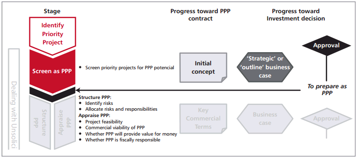 The first step towards a successful PPP is identifying a potential PPP project. Since a PPP is first and foremost a public investment, most successful PPP projects originate from the broader public investment planning process, as described in Section 2.3.1: PPP Process. At some point in this process, priority public investment projects can be screened for their potential to achieve better value for money if implemented as a PPP-several governments have established tools and checklists to support this screening. The online toolkit for PPPs in India [#141] provides a good overview of PPP project screening process.