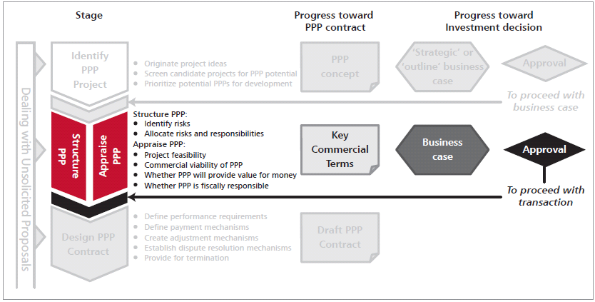 Figure 3.3: Appraise PPP Projects shows how project appraisal fits in to the overall PPP process. Initial assessment against each criterion is typically done at the project identification and initial screening stage, as described in Section 3.1: Identifying PPP Projects. Detailed appraisal is typically first done as part of a detailed 'business case', alongside developing the PPP project structure as described in Section 3.3: Structuring PPP Projects. For example, assessing the value for money of the PPP depends on risk allocation, which is an important part of PPP structuring. An initial risk allocation could be assessed for whether it will provide value for money, which assessment might result in changes to the risk allocation.
