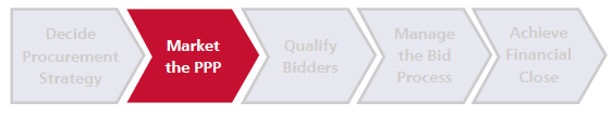 There is limited guidance material available on marketing PPP projects. Farquharson et al [#95, page 105] briefly describes the advantage of releasing information about the project prior to the formal launch, to attract bidder interest. It also describes the value of marketing a pipeline of projects, rather than a single opportunity. Particularly for new PPP programs, this gives investors a stronger incentive to engage.