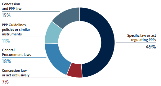 Almost half (49 percent) of the economies measured by Benchmarking PPP Procurement have adopted a law or act that specifically regulates PPPs (figure 3). In the sample of economies measured, this form is the most common way of establishing a regulatory framework for PPPs. Even within these economies, there is some heterogeneity in the coverage and name used (for example, the Philippines adopted a Build-Operate-Transfer [BOT] law rather than a PPP law) and even in the hierarchy of the adopted legal instrument (for example, Vietnam regulates PPP through an executive decree rather than a law). In addition, 7 percent of the economies (Cambodia, Chile, Costa Rica, Mongolia, Nicaragua, and Panama) have enacted only concession laws.