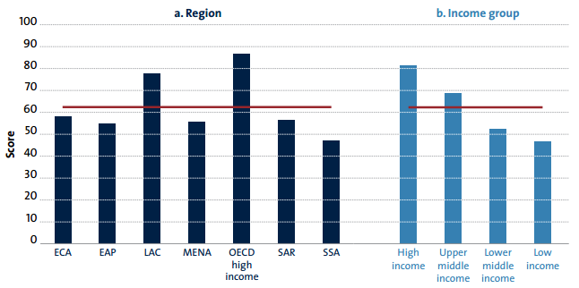 Benchmarking PPP Procurement shows regional and income group differences in the average score for USPs (figure 12). The OECD high income and LAC regions stand out from the rest of the regions. SSA region presents the lowest average score with large score variation among economies within the region, ranging from 17 to 92 points. When the data are disaggregated by income level, there is a clear pattern showing that the lower the income group level, the lower the average scores on USPs.