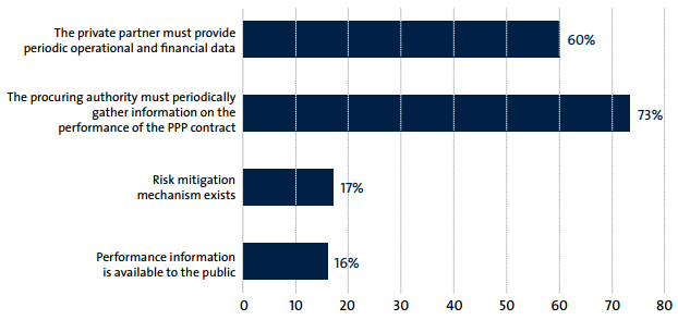Regarding the specific monitoring and evaluation mechanisms in place, as shown in figure 17, in 73 percent of the 82 economies, the procuring authority must periodically gather information about the performance of the PPP. To further promote transparency in the PPP contract execution and to increase the accountability of both parties for the contract, operational and financial data as well as performance information should be made available to the public. Brazil, Mexico, and the Republic of Korea are among a small sample of economies (16 percent) that mandate such publication.