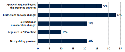 The economies measured have handled the issue of renegotiating PPP contracts differently (figure 18). Of the 82 economies, more than three quarters regulate, to some extent, the renegotiation or modification of PPP contracts. Despite the potential impact of this matter, regulatory frameworks in economies such as Algeria, Lebanon, Malawi, and Myanmar remain silent on it.86 Among the economies that address the renegotiation of PPP contracts in their regulatory framework, 10 percent consider it a contractual issue, leaving the parties to further regulate it in the contract. Such is the case, for example, in Benin, Turkey, and Zambia. In the remaining economies, some provisions are in place regarding PPP renegotiation. Among these particular provisions, there are requirements for specific approvals beyond the procuring authorities (27 percent of the economies), restrictions on changing the scope of the PPP contract (33 percent of the economies), and restrictions on changing the risk allocations of the PPP contract (21 percent of the economies).