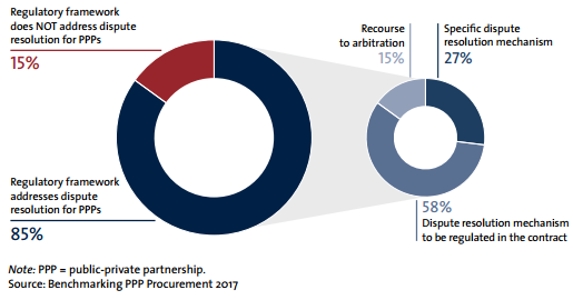 As shown in figure 19, 15 percent of the economies do not make any reference to dispute settlement mechanisms in their PPP regulatory frameworks.94 Among the economies that explicitly address dispute resolution mechanisms, the majority (58 percent) make only a general reference to the need to establish a dispute resolution system in the contract without further specification, whereas others either offer the parties the choice of having recourse to arbitration or impose a specific dispute resolution mechanism that applies to all PPP contracts.