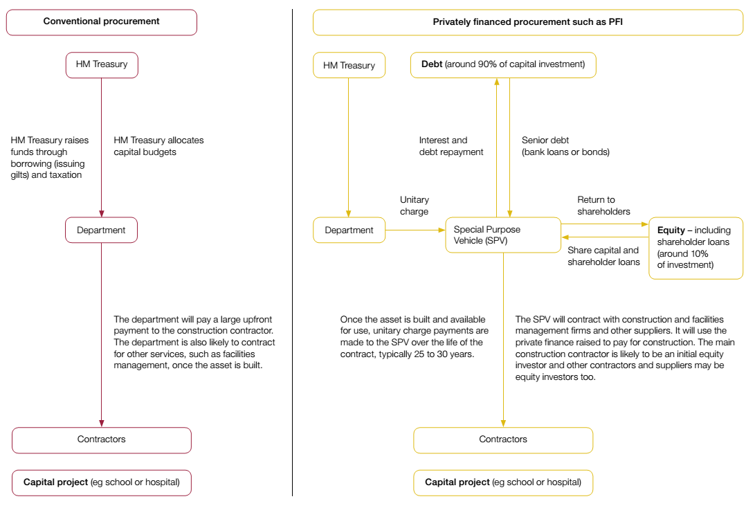1.3 The fundamental difference between conventional public procurement and PFI procurement for capital investment relates to which party raises finance for the asset's construction (Figure 1). In conventional procurement the private sector is still involved (private contractors build the asset) but the public sector provides the finance. When the public sector procures an asset using PFI, a private company - a Special Purpose Vehicle (SPV) - is formed and it raises finance from debt and equity investors to pay for construction. Once the asset is constructed and available for use the taxpayer makes 'unitary charge' payments to the SPV over the contract term, usually 25 to 30 years. This charge includes debt and interest repayments, shareholder dividends, asset maintenance, and in some cases other services like cleaning. These payments will be agreed at the start of the contract and some or all of them will be linked to inflation. All of these aspects remain in the PF2 model which replaced PFI in 2012 (see Part Three); the costs and benefits of PFI discussed in this section also apply to PF2.
