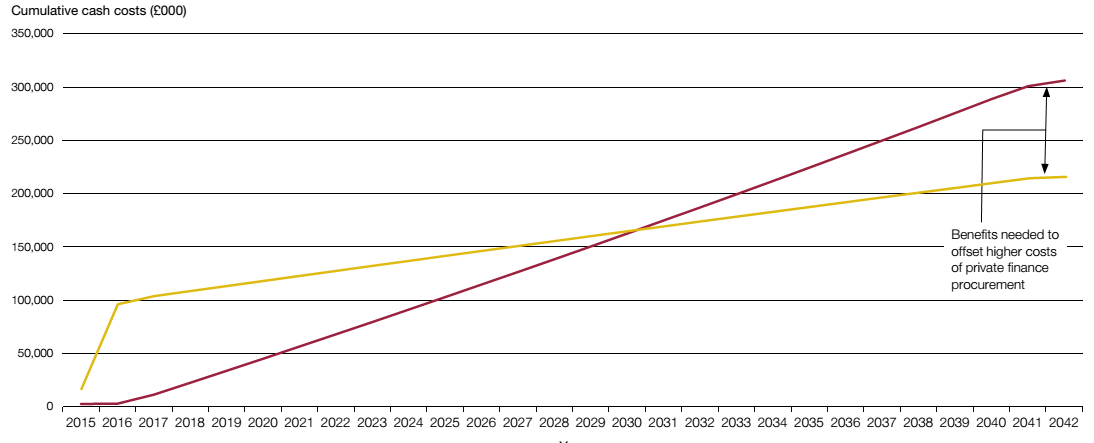 1.19 The higher cost of finance, combined with these other costs, means that overall cash spending on PFI and PF2 projects is higher than publicly financed alternatives. The Department for Education has estimated the expected spend on PF2 schools compared with a public sector comparator (PSC). Our analysis of these data for one group of schools shows that PF2 costs are around forty per cent higher than the costs of a project financed by government borrowing (Figure 4 overleaf). The Treasury Committee undertook a similar analysis in 2011, which estimated the cost of a privately financed hospital to be 70% higher than the PSC.22