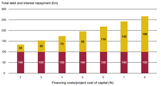 1.17 Private finance procurement results in additional costs compared to publicly financed procurement, the most visible being the higher cost of finance. The 2010 National Infrastructure Plan estimated an indicative cost of capital for PFI as 2% to 3.75% above the cost of government gilts.18 Data collected by IPA on PFI and PF2 deals entered into since 2013 show that debt and equity investors are forecast to receive a return of between 2% and 4% above government borrowing.19 However, some 2013 deals, agreed when credit market conditions were poor, projected an annual return for debt and equity investors of over 8%; this was more than 5% higher than the cost of government borrowing at the time.20 Small changes to the cost of capital can have a significant impact on costs - as an illustration: paying off a debt of £100 million over 30 years with interest of 2% costs £34 million in interest; at 4% this more than doubles to £73 million (Figure 3).