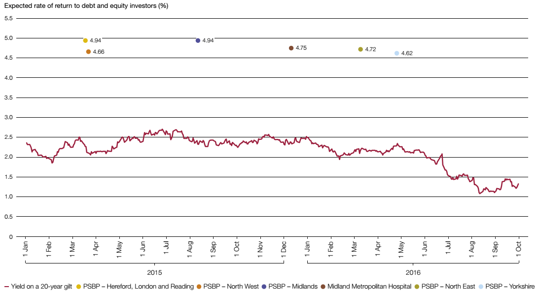 3.14 While any reduction in the cost of equity provides savings for taxpayers, equity typically makes up just 10% of the financing structure. The other 90% is provided in the form of senior debt. It is therefore important to consider the debt costs in order to calculate the overall return to investors and costs for taxpayers. Information on debt costs and total return to investors is collected by the IPA but is not published. The projected return to investors (debt and equity) after tax for the six PF2 deals agreed so far is between 4.5% and 5% - approximately double the cost of government borrowing at the time these deals were agreed (Figure 17).