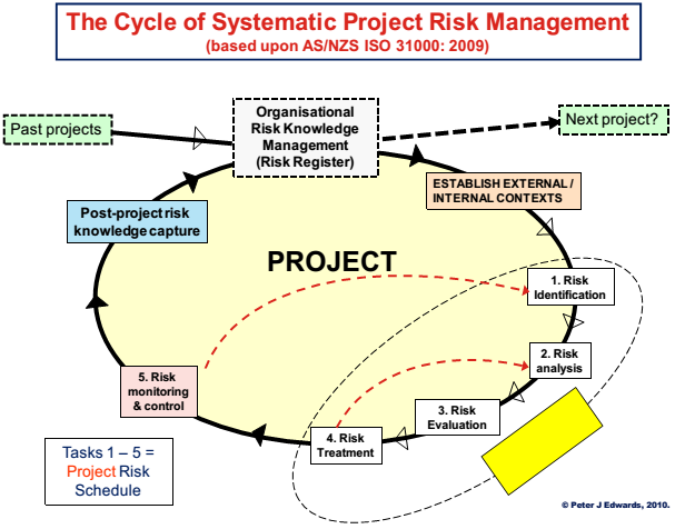 This loop, they claim, is particularly important during the monitoring and review stage as this is when new risks are typically identified or the circumstances of known risks change (Edwards and Bowen 2005: p.98). They also note the importance of post-project risk knowledge capture; an aspect not dealt with in the risk management processes reflected in ISO 31000.