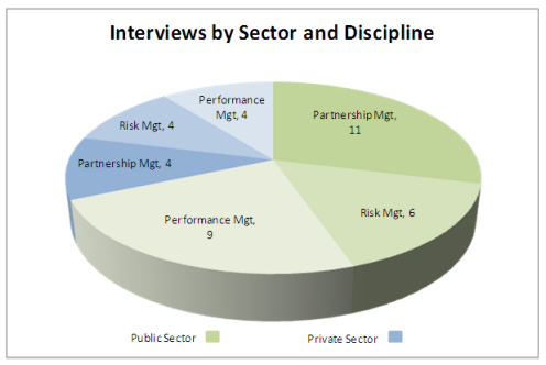 The interviewing process was conducted between October 2012 and March 2013. Fifty invitations were distributed and 34 people (68% response rate) agreed to participate in the formal process. Of the remaining 16, eight invitees declined to participate and a further eight did not respond. Twenty-three participants (68%) were from the public sector and 11 (32%) from the private sector. Seven respondents took part in a second interview involving a different management discipline i.e. partnership, risk or performance management, bringing the total to 38 interviews (three interviews involved interviewing two participants at the same time and one of these respondents took part in a second interview).