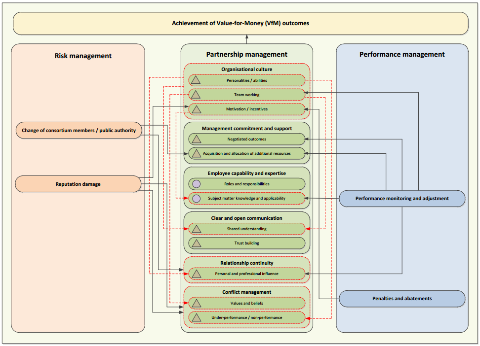 The IMM cover sheet, showing the conceptual outline of the model, is depicted in Fig. 9.1. Table 9.15 then presents the VfM factors, evidence-base and treatment options for partnership issues in the IMM. Fig. 9.2 places partnership management in the central place, flanked by its associated risk management and by cross-over issues of performance management. Table 9.16 outlines example partnership management risks and re-states the treatment options for ease of reference. Here precise risk statements are attempted (for typical risk examples only), each dealing with the trigger event and its likelihood of occurrence, the consequence(s) of the event, and usually with some reference to duration of exposure to the event and / or consequences. Edwards and Bowen (2005) advocate precise risk statements as important for fully understanding each identified risk; informing evaluation processes and risk treatment decisions; and guiding monitoring and control procedures. Table 9.17, Fig. 9.3 and Table 9.18 position performance management as the central focus.