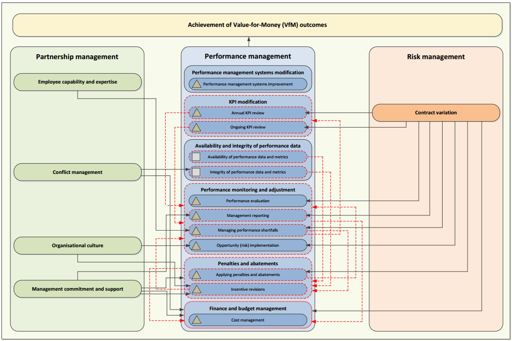 Performance management systems improvement: • Systems capability reviewed in conjunction with planned modification of KPIs • Systems have capability / capacity to measure lagging and leading indicators • Systems have capability / capacity to analyse trends | Performance evaluation: • Benchmark employee deliverables against job descriptions including outputs and outcomes specified in contract management manuals • Adherence to agreed policies, frameworks and procedures • Progress made against work plans and technical assessments e.g. asset management plans, issues registers etc • Documents agreed project decisions for future reference • Performance audits • Benchmarking / competitive market testing • Monitor the financial strength of consortia • Review insurance policies • Progress made against the achievement project business case objectives / justifications made for amending a contract • Review and implement findings from service user experience surveys • Regular discussion about future organisational direction with private partner Management reporting: • Project reporting used as a foundation for interpreting strategy into work plans, measuring strategic objectives and conducting skills appraisals • Developing further (or refining existing) control actions Managing performance shortfalls: • Employee skills appraisals • Disciplinary action taken against consistently under-performance employees • Sub-contracting arrangements • Modification of KPIs • Contract amendment Opportunity (risk) implementation: • Maintenance of an innovation register • Linking innovative ideas to incentive schemes to encourage better performance | Annual KPI review: • Agreed between partners prior to commencement of each contract year • Alterations are relevant, measurable, repeatable and achievable • Rationale for modification fully documented Ongoing KPI review: • As above (albeit with more regular review) | |