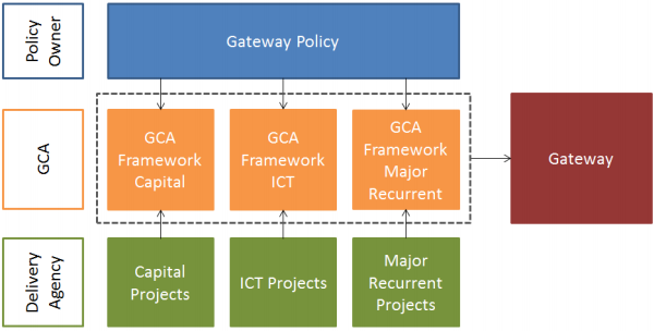 The following diagram summarises the interaction between Gateway Policy, GCA Frameworks and delivery of Gateway reviews as well as the responsible stakeholders.