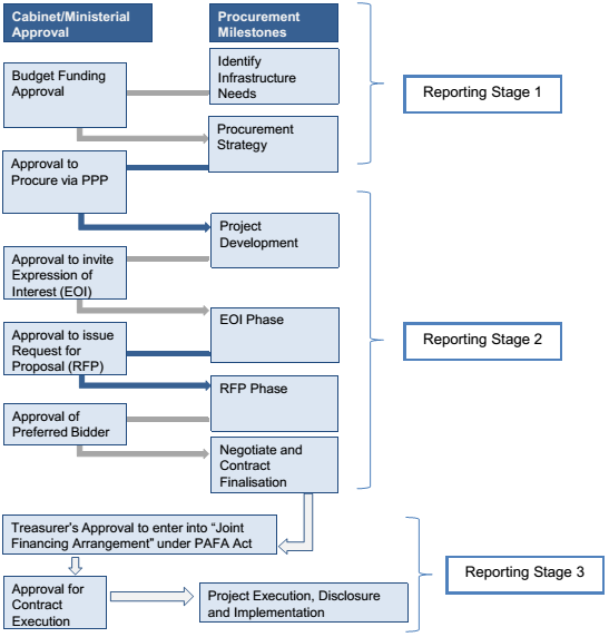 Availability PPPs follow the approval and procurement stages per the diagram below (sourced from Figure 3.1 of the existing NSW Public Private Partnerships Guidelines) Each reporting stage of Budgeting for Availability PPPs has been identified alongside this diagram.