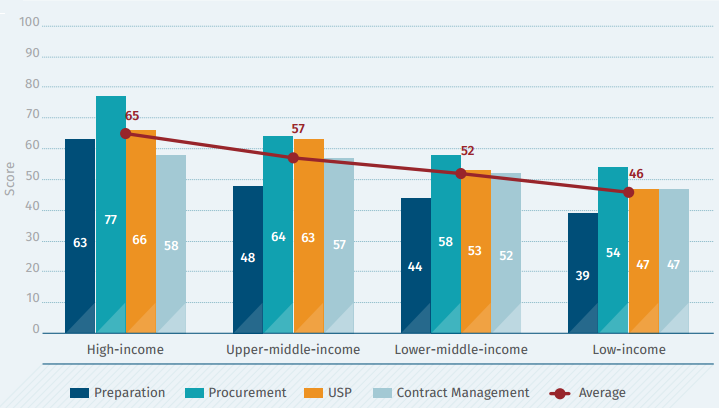 The higher the income level of the group, the higher the performance in the assessed thematic areas. Preparation and contract management are the areas that have the most room for improvement across all income level groups (Figure ES1).