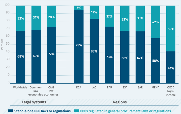 Figure 2 Stand-alone PPP laws worldwide, by legal system and region (percent, N = 135)