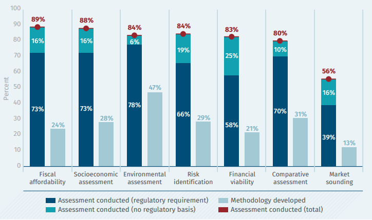In more than 80 percent of the economies surveyed, six of the seven assessments are performed (the exception is market sounding) (Figure 5). However, less than one-third of the economies have developed specific methodologies for conducting such assessments, and an even smaller percentage of economies (just slightly over 20 percent) make those assessments available online.