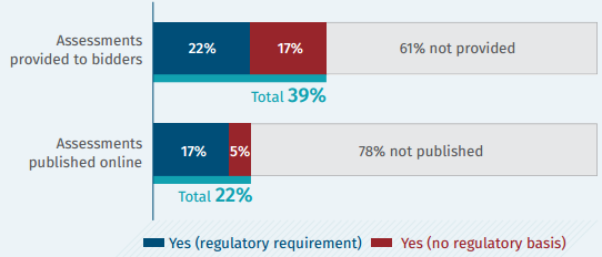 The preparation assessments are primarily a source of information for the procuring authorities. However, further disclosure and publication of the assessments allow all stakeholders to fully understand the project. Moreover, the transparency achieved by publishing the assessments is likely to exert pressure on the procuring authority to choose the right project, narrowing the space for inefficiencies and potential corruption. Similarly, disclosing the assessments results to potential bidders through information memorandums or similar documents included in the tender documentation or request for proposal (RFP) can help bidders make an informed bidding decision and submit better prepared bids. For these reasons, this year's survey also inquired about whether the required assessments are made available to the public and published online, and whether the results of the assessments are included as part of the tender documents shared with potential bidders (Figure 6).
