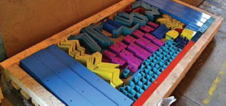 A crate of coloured brackets and fixing connections, which match to coloured stickers positioned on the components during the manufacturing process.