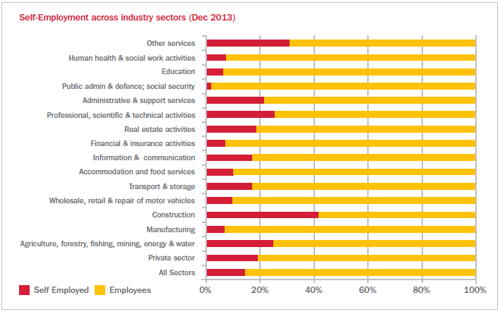 A Review of Industry Training Boards7 published by BIS in December 2015 referenced 40% of total construction contracting jobs as being self-employed compared with 15% across the whole economy.