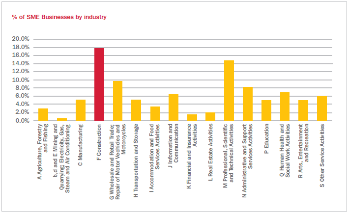 There is a high volume of SME businesses in the construction industry with just under a fifth of all SMEs working in construction8 at the start of 2015 as shown in Figure 7.