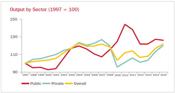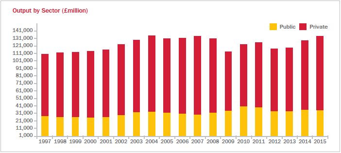 Figure 9: Output by sector rebased to 1997, Output in the Construction Industry, Table 2A, Office for National Statistics, July 2016