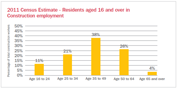In 2015, the Arcadis paper, People & Money,16 highlighted labour availability within construction as being the biggest constraint on the industry over the next five years if it is to achieve the Government's aspiration of one million homes. It demonstrated a need to recruit another 700,000 people to replace those retiring / natural leakage to other industries, this is in addition to the extra workforce needed of 120,000 to deliver capacity growth. The 2011 Census data (Figure 13) shows us 30% of the workforce at the time aged over 50 therefore if we look to ten years from now in 2026 this represents around 620,000 people, based on the construction classification used, who will have retired from the industry.