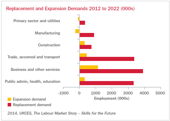 Figure 14 from UKCES shows the number of replacement demand needed in the construction industry as being more than double the expansion demand.