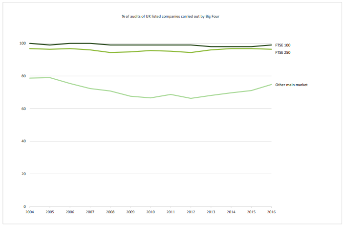 202. There is little sign, however, that those changes have had any substantial impact on the audit market. In 2016, the Big Four audited 99% of the FTSE 100 and 97% of the FTSE 250.539 This dominance has been almost constant since the demise of Arthur Andersen. If anything, the Big Four has further strengthened its grip. In 2016, it audited 75% of listed firms outside the FTSE 250 for the first time since 2006. The Secretary of State for Business, Energy and Industrial Strategy has argued that "increasing capacity in the FTSE 350 audit market would clearly be beneficial".540
