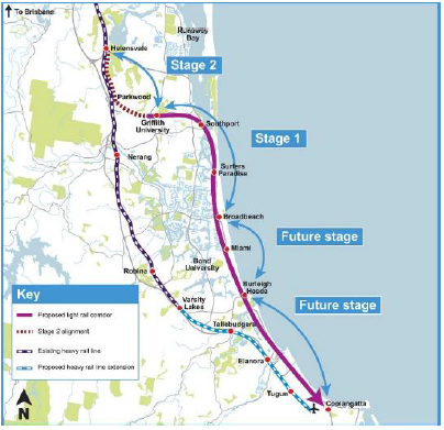 | It was always contemplated that the light rail system would be extended north of Gold Coast University Hospital/Griffith University, to connect to the existing heavy railway at Helensvale, and south of Broadbeach to Burleigh Heads and then to Coolangatta. These extensions were contemplated in the Concept Design and Impact Management Plan (CDIMP), published in 2009, two years before the PPP contract was signed. The CDIMP contemplated that the extensions from Gold Coast University Hospital/Griffith University to Helensvale, and from Broadbeach to Burleigh Heads would be delivered between 2016 and 2026, i.e. during the term of the PPP contract. It contemplated that the extension from Burleigh Heads to Coolangatta would occur after 2026.28 Whilst the Operator Franchisee acknowledged in the PPP contract that it had no right to participate in future stages of light rail network, the reality was always going to be quite different, as subsequent events have shown. |
