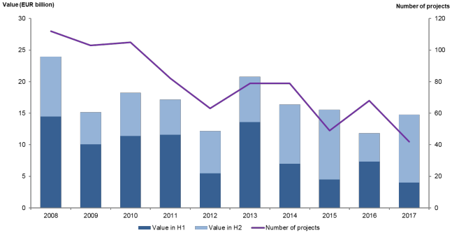 Figure 1: 10-year view of the European PPP Market by Value and Number of Projects (2008-2017)