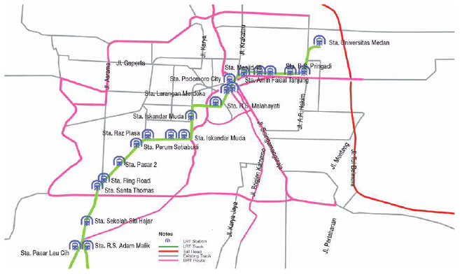 The urban railway will stretch from Southwestern part to Northeastern part of Medan City which accomodate integration between LRT and BRT as shown in the picture below.