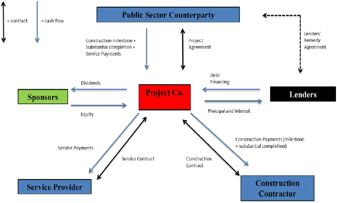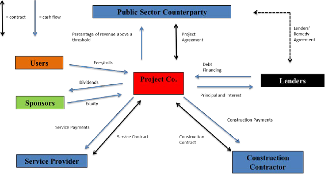 | Box 1. Different country definitions of public-private partnerships There is no widely recognised definition of PPPs and related accounting framework. Eurostat, IASB, IMF, IFRS and others work with different definitions. As illustrated below there is variation between countries. Korea defines a public-private partnership project as a project to build and operate infrastructure such as road, port, railway, school and environmental facilities - which have traditionally been constructed and run by government funding - with private capital, thus tapping the creativity and efficiency of private sector. South Africa defines a public-private partnership as a commercial transaction between a government institution and a private partner in which the private party either performs an institutional function on behalf of the institution for a specified or indefinite period, or acquires the use of state property for its own commercial purposes for a specified or indefinite period. The private party receives a benefit for performing the function or by utilising state property, either by way of compensation from a revenue fund, charges or fees collected by the private party from users or customers of a service provided to them, or a combination of such compensation and such charges or fees. The United Kingdom defines a public-private partnership as "…arrangements typified by joint working between the public and private sectors. In their broadest sense, they can cover all types of collaboration across the private-public sector interface involving collaborative working together and risk sharing to deliver policies, services and infrastructure." (HMT, Infrastructure Procurement: Delivering Long-Term Value, March 2008). The most common type of PPP in the United Kingdom is the Private Finance Initiative. A Private Finance Initiative is an arrangement whereby the public sector contracts to purchase services, usually derived from an investment in assets, from the private sector on a long-term basis, often between 15 to 30 years. The State of Victoria (Australia) defines a public-private partnership as relating to the provision of infrastructure and any related ancillary service which involve private investment or financing, with a present value of payments for a service to be made by the government (and/or by consumers) of more than AUD 10 million during the period of a partnership that do not relate to the general procurement of services. Source: OECD (2012), Principles for Public Governance of Public-Private Partnerships. |