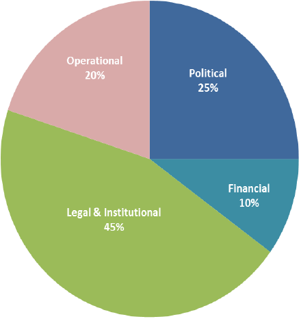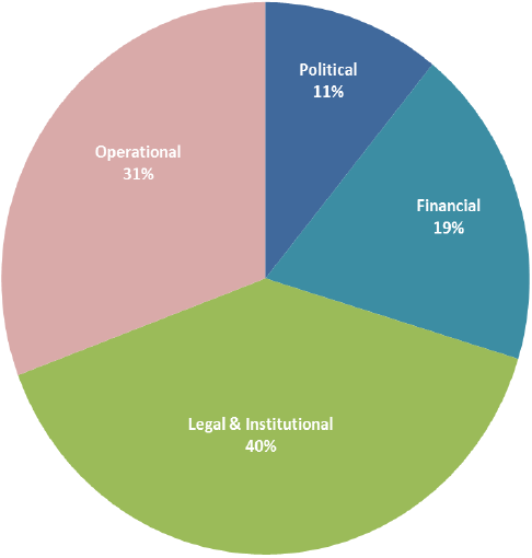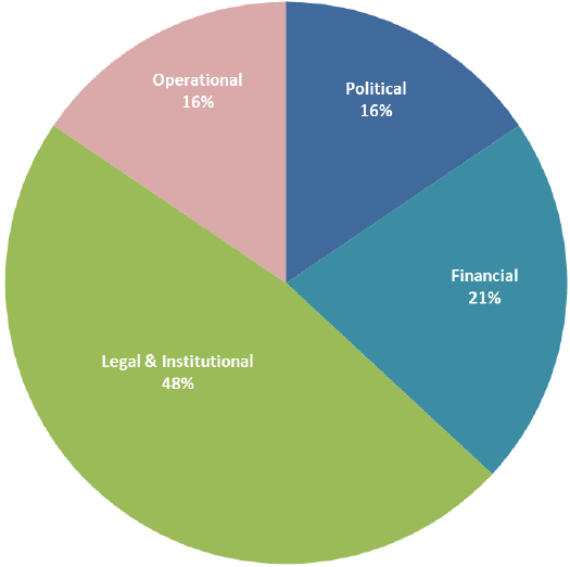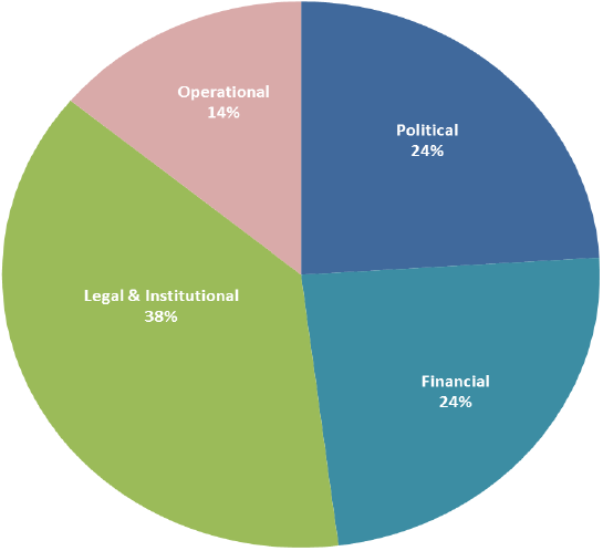 126. In each of the focus countries, legal and institutional risks are the most frequent barriers identified. Together with operational risk, legal and institutional barriers make up the majority of obstacles encountered, with a low of 52% in Egypt, 64% in Jordan, 65% in Tunisia and a high of 71% in Morocco. This is consistent with the major findings of the handbook but runs contrary to the view sometimes expressed that political risk is the most important factor inhibiting investment in the region. Political risk is cited as a barrier in a low of 11% of projects in Morocco, rising to 16% in Jordan, 24% in Egypt and 25% in Tunisia, the percentages for the latter two reflecting political events since 2011.