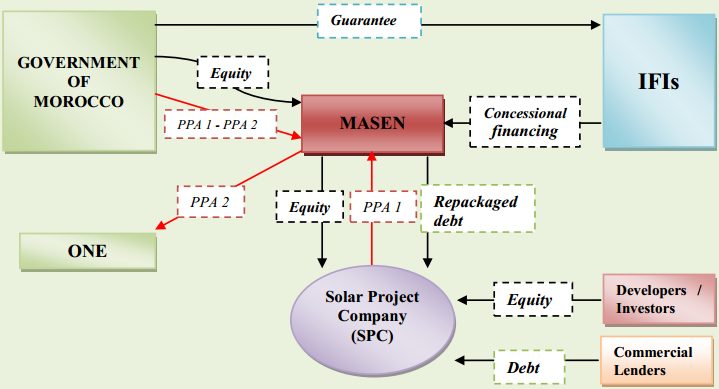 | Box 11. Morocco: The Ouarzazate "Noor 1" CSP Project The Ouarzazate Concentrated Solar Power (CSP) project, also referred to as "Noor" (i.e. "light" in Arabic), is one of the projects identified and designed within the MENA CSP Scale-Up Initiative, a regional programme financed by the Clean Technology Fund and led by the World Bank and the African Development Bank, with plans to install 1.2 GW across Algeria, Egypt, Jordan, Morocco and Tunisia. The project is being developed through PPP, with competitively-selected partners, by a Special Purpose Vehicle: a consortium of private developers and the newly-created Moroccan Agency for Solar Energy (MASEN). Phase 1 of the 500 MW Power Plant Project (160 MW) will make the Ouarzazate CSP Project the largest solar independent power producer (IPP) in the world. Project Rationale Concentrated Solar Power has enormous unexploited potential in the region as a reliable source of renewable energy. However, despite its relatively long track record, CSP technology remains in its early stages of development and is still not commercially viable. In Morocco, where heavy fossil-fuel subsidies distort energy prices, the resulting competitiveness gap between CSP and less expensive carbon-intensive energy alternatives is particularly evident. The Government of Morocco, together with a group of multilateral development banks and private-sector sponsors, is developing the 160 MW Ouarzazate CSP Project, labelled "Noor 1". Located 200 km south of Marrakesh, the plant should come on line by 2015 and help Morocco avoid 240,000 tons of CO2 emissions a year, the equivalent of removing 80,000 cars from the road annually. The project has two over-arching objectives: • Installing CSP at a scale that successfully demonstrates the storage technology component, and generates cost reductions and associated economic benefits (local manufacturing, energy security and a shift away from fossil fuels) ; • Testing a business model, via the PPP formula, that could increase private-sector backing and increase availability of capital and know-how to support the development of a CSP portfolio. Project Characteristics The first Ouarzazate solar plant will have a capacity of 125 to 160 MW and will use the most mature CSP technology currently available: parabolic trough, with three hours of molten salt thermal energy storage capacity. Construction of the plant is underway, and commercial operation expected in the second half of 2015. Key stakeholders include: • The Government of Morocco and the Moroccan Agency for Solar Energy (MASEN), which are expected to contribute USD 883 million over the life of the plant (mostly in the form of operational subsidies) ; • International financial institutions and other donors which have committed in excess of USD 1 billion for the construction of the facility; • A consortium of private developers, which will contribute USD 190 million of equity capital and expertise for an estimated 14% after-tax rate of return. ACWA Power International (95% Saudi Arabia), Aries Ingenieria y Sistemas (Spain), TSK (Spain). Contract Scheme • Greenfield project, Build-Own-Operate-Transfer (BOOT). • Duration: 25 years PPA. • Contractual arrangements - EPC Contractor: Acciona, Sener and TSK (Spain). - Off-taker: Office National d'Electricité (ONE). - Tariff Rate (PPA): 1.62 dirhams per kWh. Figure 6. Noor 1: Institutional and Financing Framework