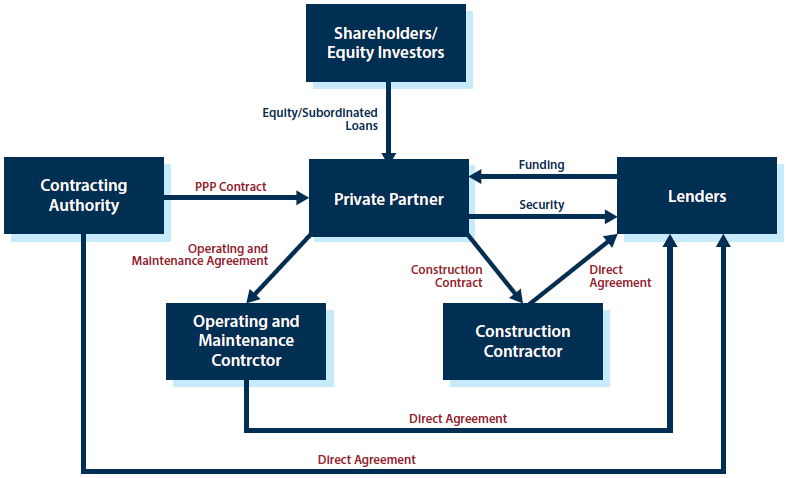 This diagram shows the key parties and contracts involved in a typical PPP Project. The Contracting Authority contracts with the Private Partner through the PPP Contract and also enters into a separate "Direct Agreement" with the Lenders (see Section 6, Lenders' Step-in Rights). The Lenders provide funding to the Private Partner and take security over the Private Partner's assets for the repayment of such funding. The Lenders also enter into Direct Agreements with the Construction Contractor and Operating and Maintenance Contractor typically retained by the Private Partner to build and operate the project as required under the PPP Contract. The Shareholders/Equity Investors own the Private Partner, providing funding to it by means of equity and shareholder loans (the repayment of which is subordinated to the Lenders' funding).