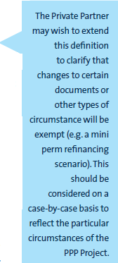 means: (a) any amendment, variation, novation, supplement or replacement of any Senior Finance Documents; (b) the grant of any waiver or consent, or the exercise of any similar right under any Senior Finance Documents; (c) the creation of or granting of any form of benefit or interest in the Senior Finance Documents, or the creation or granting of any rights or interest in any contracts, revenues or assets of the Private Partner whether by way of security or otherwise; and (d) any other arrangement having been put in place by any person which has an effect similar to any of (a) to (c) above or which has the effect of limiting the Private Partner's ability to carry out any of (a) to (c) above. |