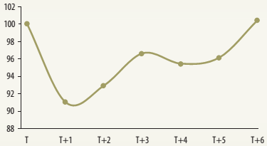 In non-oil-rich countries, the drop in income per worker is not as pronounced. | FIGURE 1A.2: Behavior of Income per Worker after an Energy Price Plunge in Sub-Saharan Africa (weighted average, index) | |