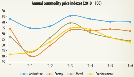 Output per worker drops about 9% in the first year and takes five years to recover to the pre-shock level. | FIGURE 1A.1: Evolution of Commodity Prices after an Energy Price Plunge in Sub-Saharan Africa