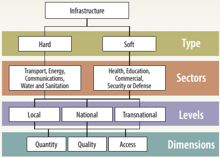 | Hard and soft infrastructure comprise different sectors. At the same time, there is a great deal of heterogeneity within a single sector. For instance, the transportation sector includes roads, airports, water ports, railways, and subways, and each of these subsectors is characterized by different costs, planning techniques, and maintenance requirements. Furthermore, the energy sector is also composed of heterogeneous subsectors, like electric energy, hydro energy, gas, and oil, among others. Another element to consider in the definition of economic infrastructure is its level, namely, local, national, and transnational (Fourie 2006).a The level adds spatial dependence and spatial heterogeneity to the data. The level is also relevant because it builds a component of endogenous placement for infrastructure (Anselin 1988). For instance, it might not be necessary to have a dam in every state-because a dam might provide services to neighboring states. Sharing a border and complying with globalization decisions will also affect the mode of infrastructure provision. For instance, very localized and globalized goods are becoming more important because of technological improvements (Fourie 2006; Taylor 2010). | FIGURE B2.1.1: Infrastructure Classification